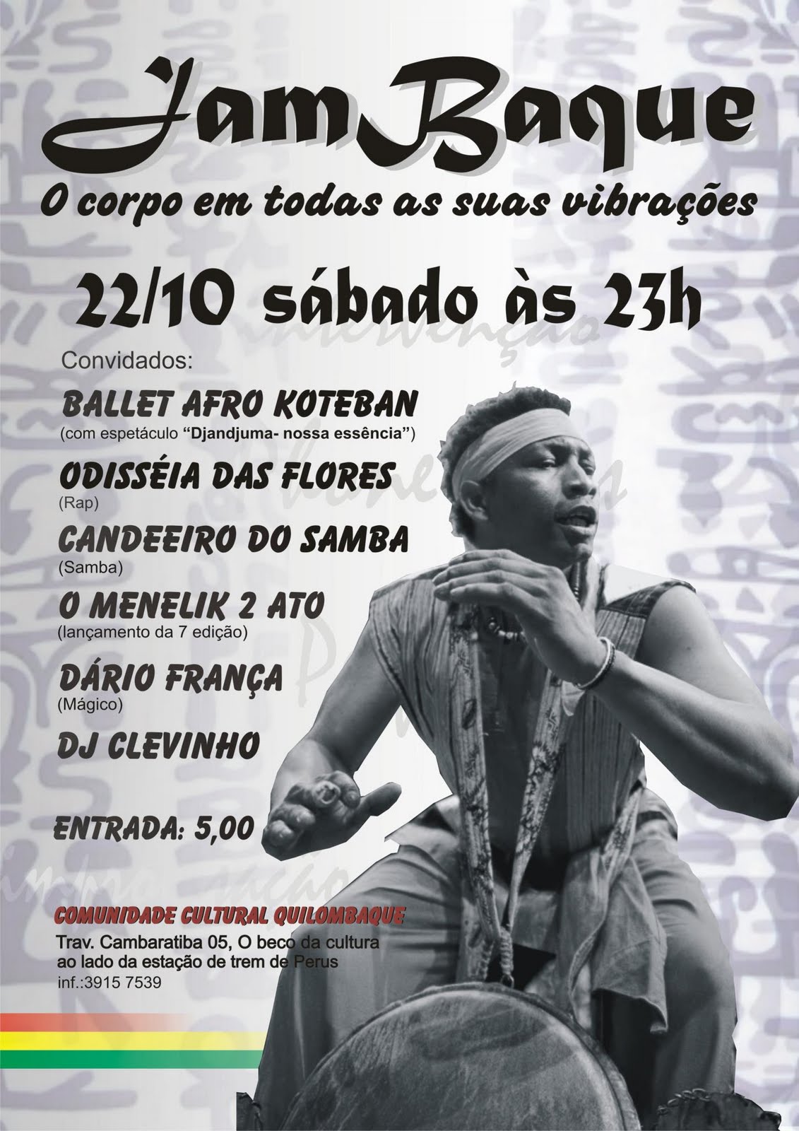 Entre as atrações, estarão presentes o Ballet Afro Koteban, trazendo a cultura do povo Mandingue do Oeste da África com o espetáculo “Djandjuma- nossa essência”, a roda do candeeiro do samba , o rap forte das meninas do Odisséia das Flores, o lançamento da revista “O Menelik 2º Ato Coletivo”, e as mágicas de Dario França, além das pickup que será comandada pelos Dj Clevinho (Phone Rap’s). Tudo isso pela pechincha de R$ 5,00!
